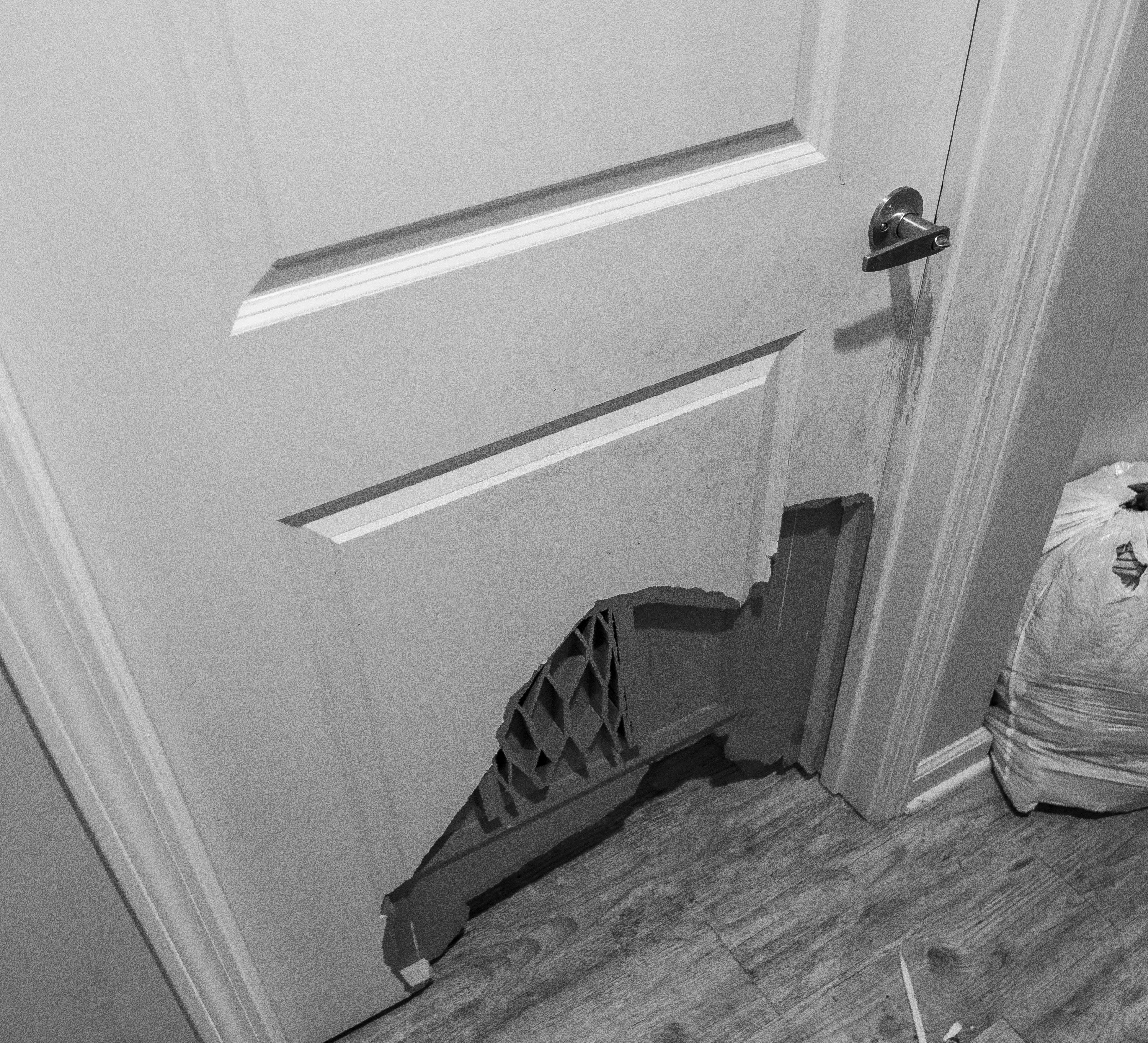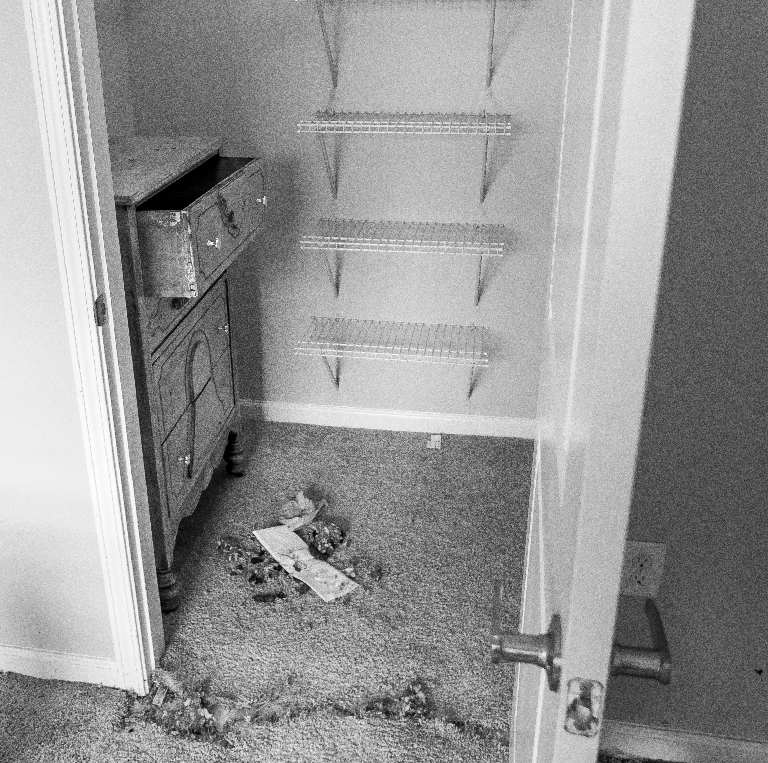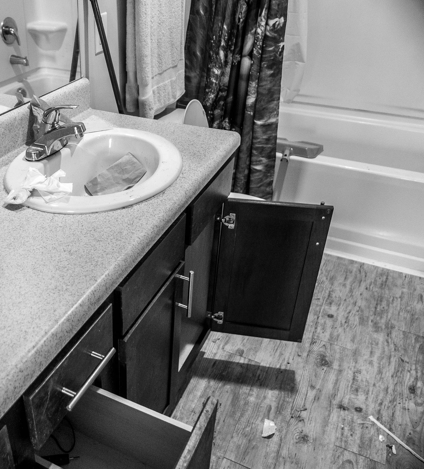 The architecture of the space continues to perform its intended functions. Doors open. Closets hold. Cabinets close imperfectly, or not at all. The bathroom retains its fixtures, its reflective surfaces, its suggestion of routine. Yet each of these elements appears slightly misaligned with its purpose, as if use has outpaced care. The hole in the door is the only overt gesture toward violence, but even that reads less as an incident than as a remainder. It has already passed into the background of the space, absorbed into its general condition.