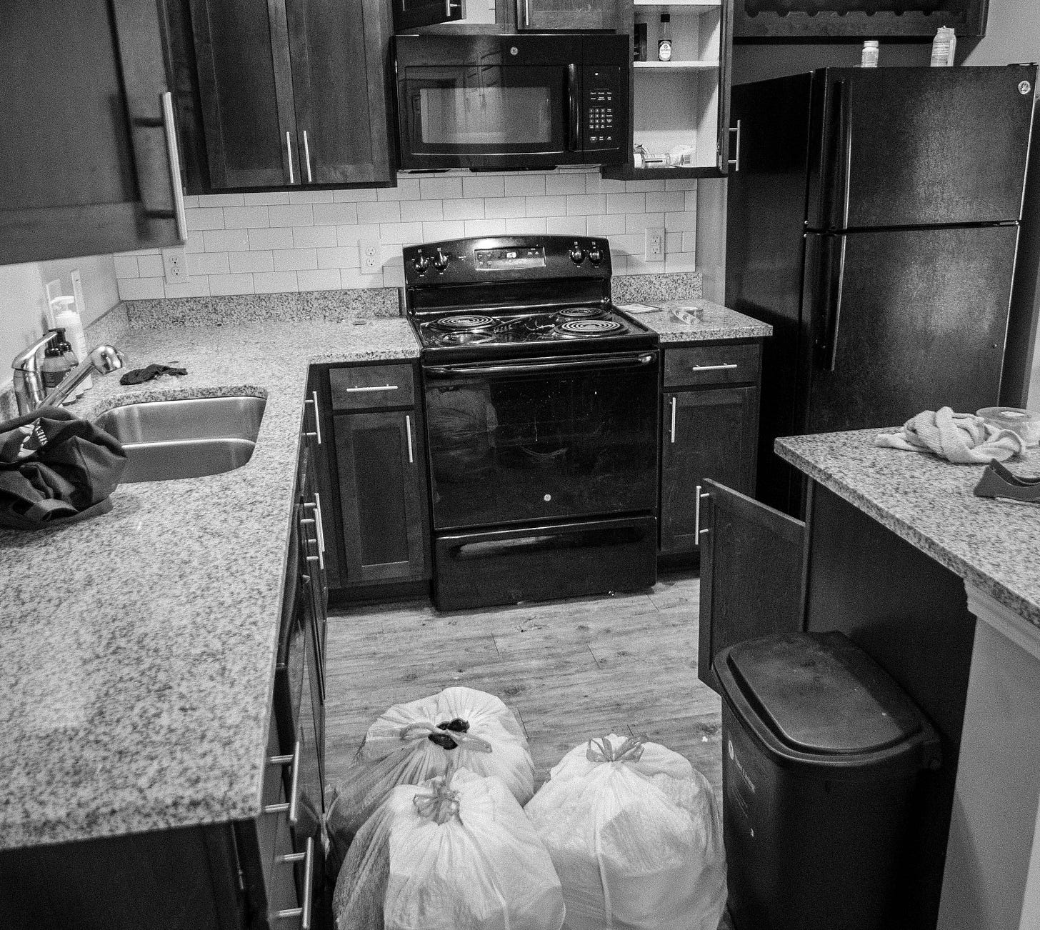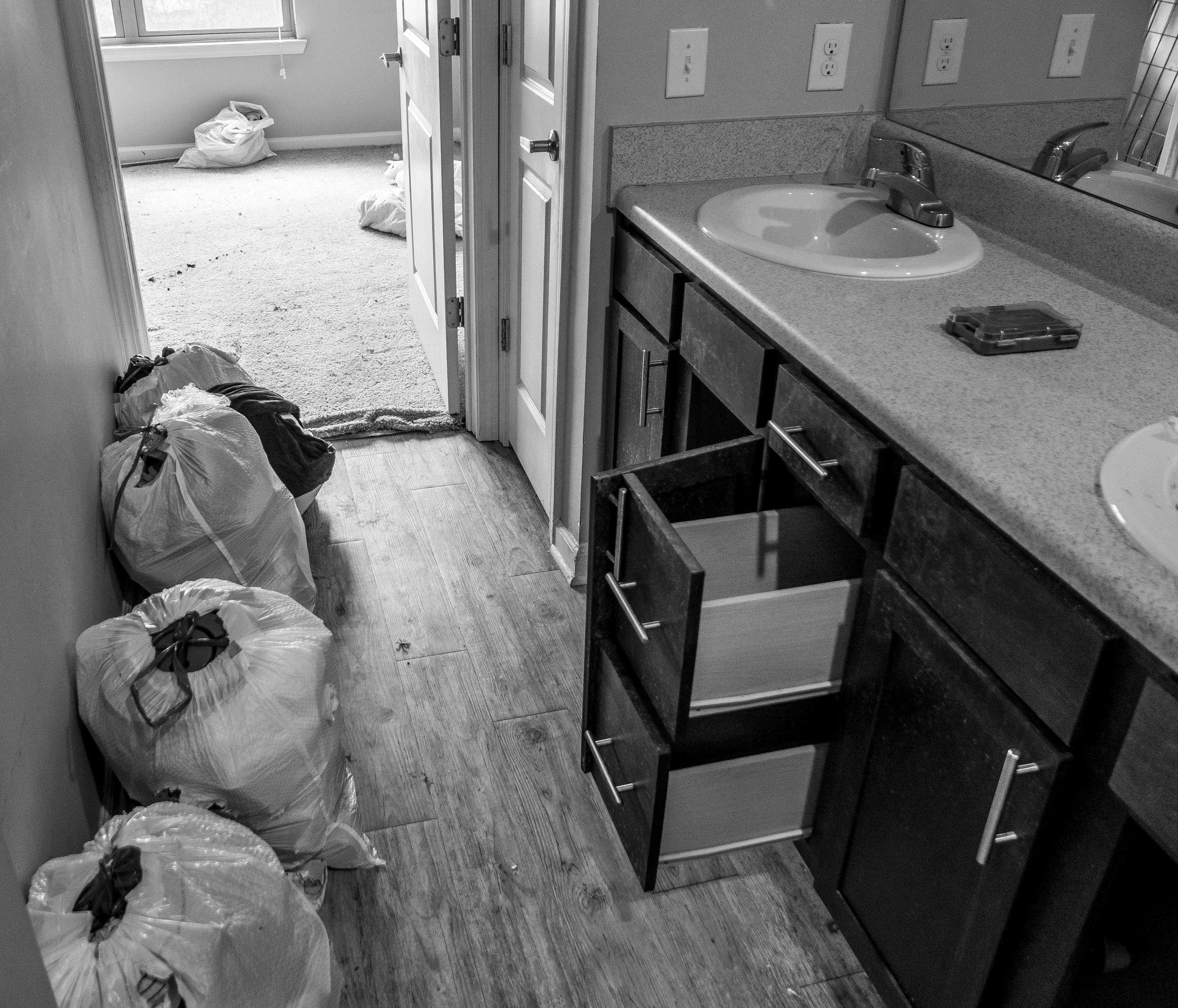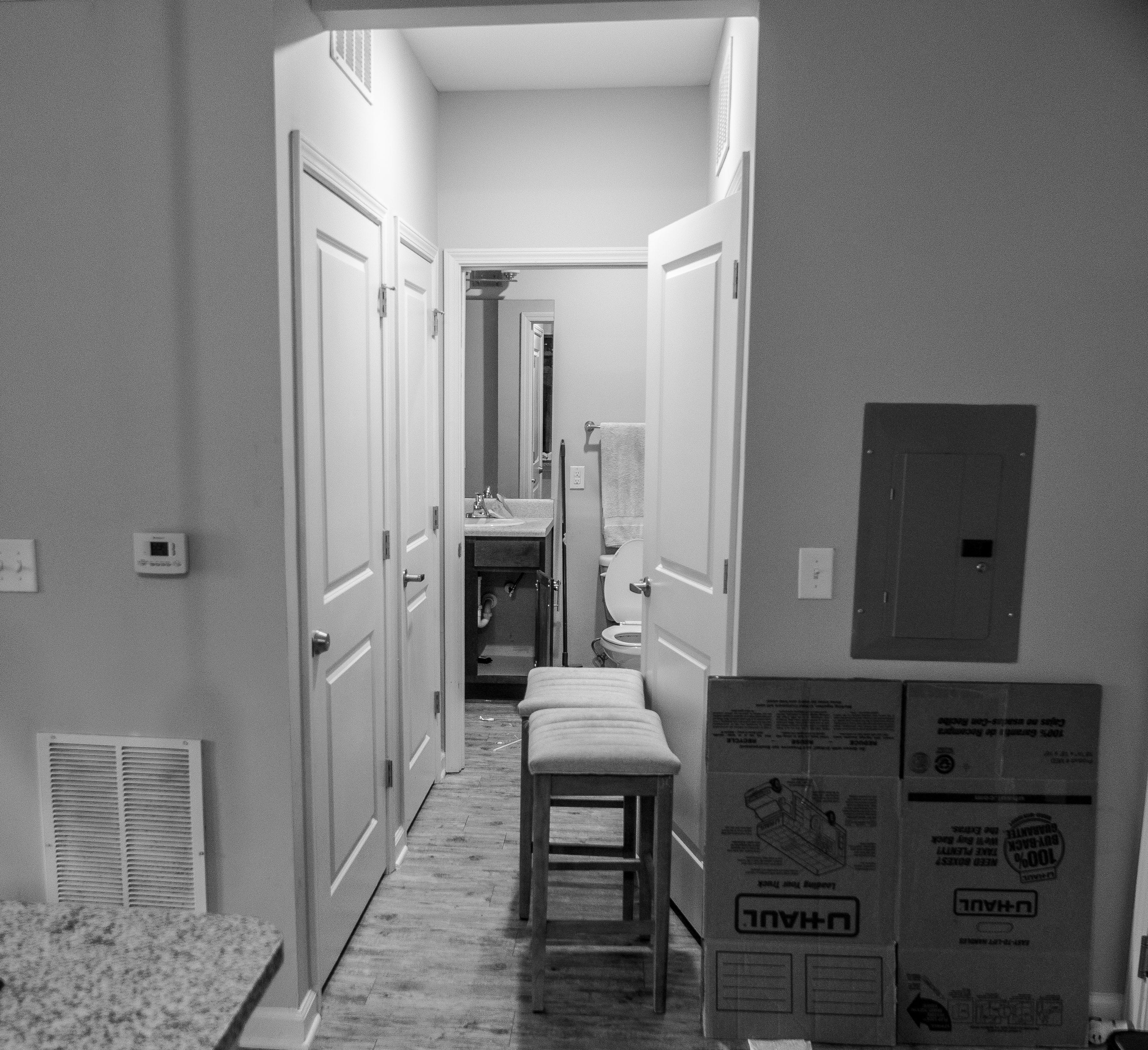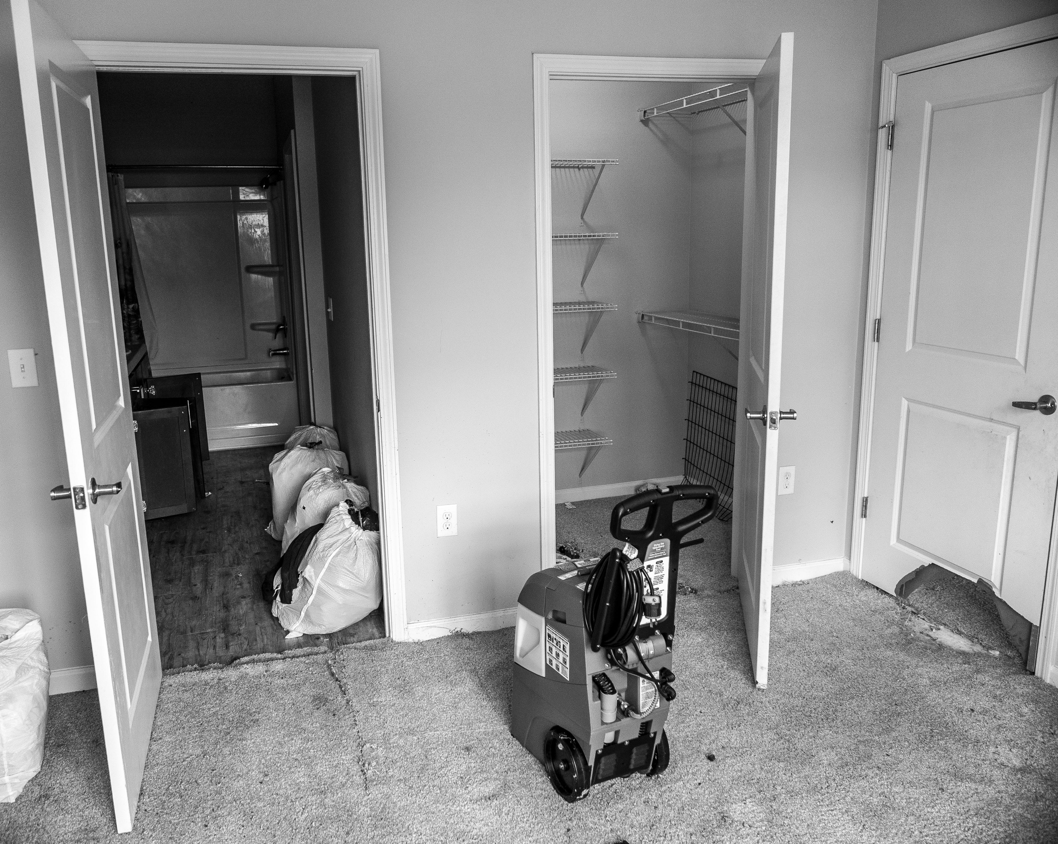 The architecture of the space continues to perform its intended functions. Doors open. Closets hold. Cabinets close imperfectly, or not at all. The bathroom retains its fixtures, its reflective surfaces, its suggestion of routine. Yet each of these elements appears slightly misaligned with its purpose, as if use has outpaced care. The hole in the door is the only overt gesture toward violence, but even that reads less as an incident than as a remainder. It has already passed into the background of the space, absorbed into its general condition.