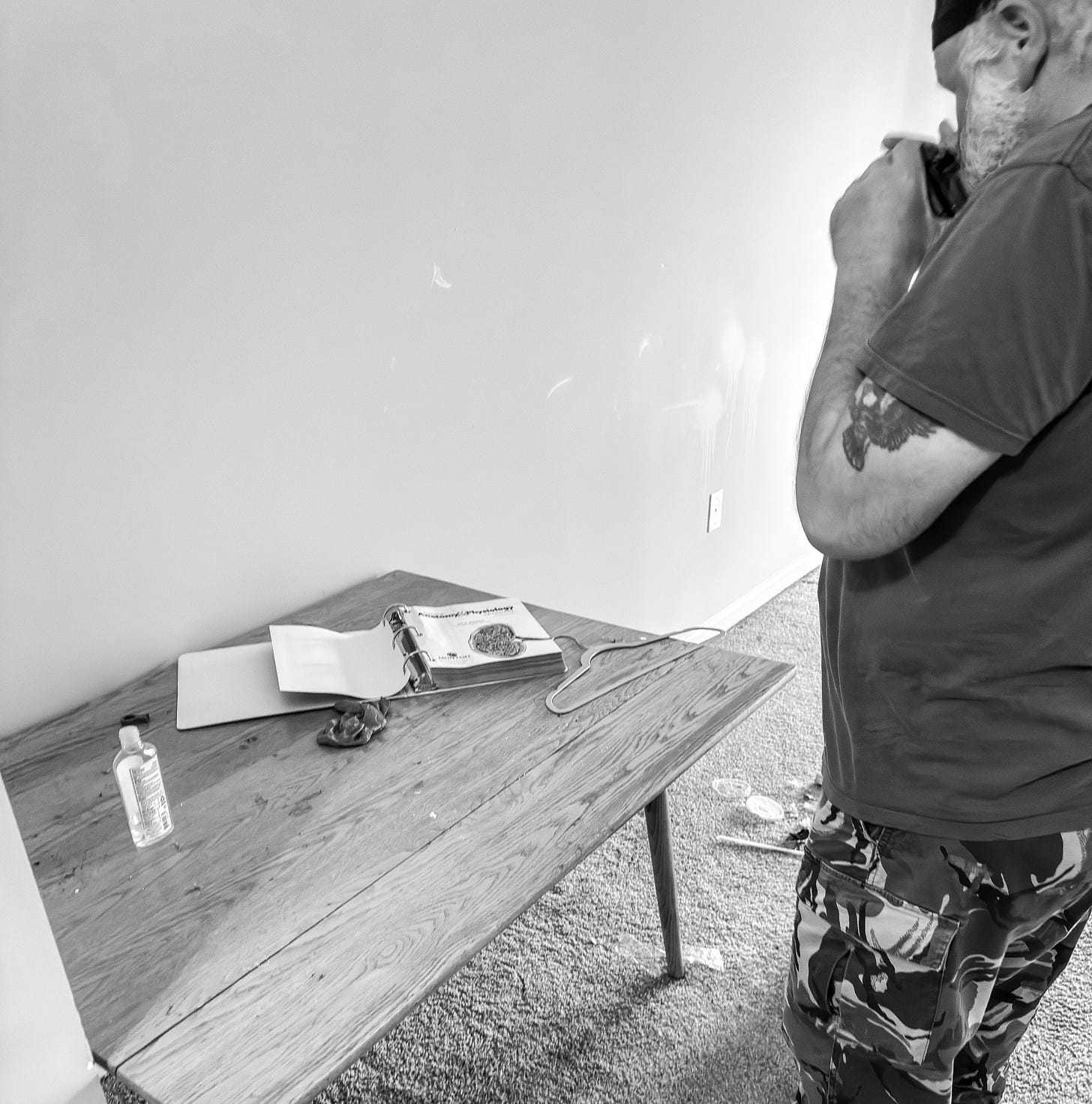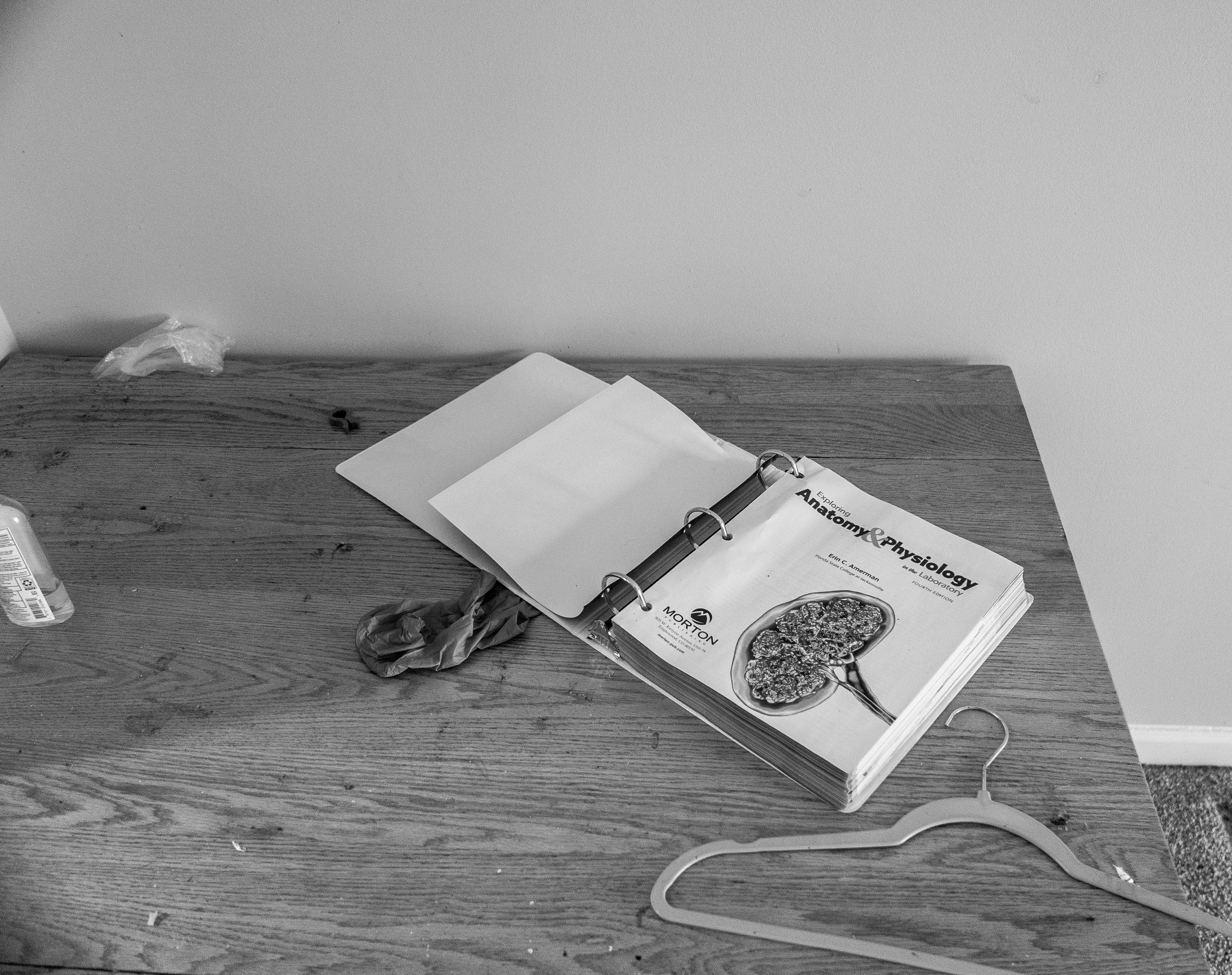 The table suggests order that was never sustained. A binder lies open, its contents concerned with the human body—anatomy, physiology—rendered in the language of structure, systems, coherence. It is the kind of material that assumes a body can be understood, mapped, accounted for. Here, it rests without commentary, its clarity intact but its context displaced. Nearby, a hanger lies flat, no longer serving even the minimal function it was designed for. The objects do not contradict one another; they simply fail to align.