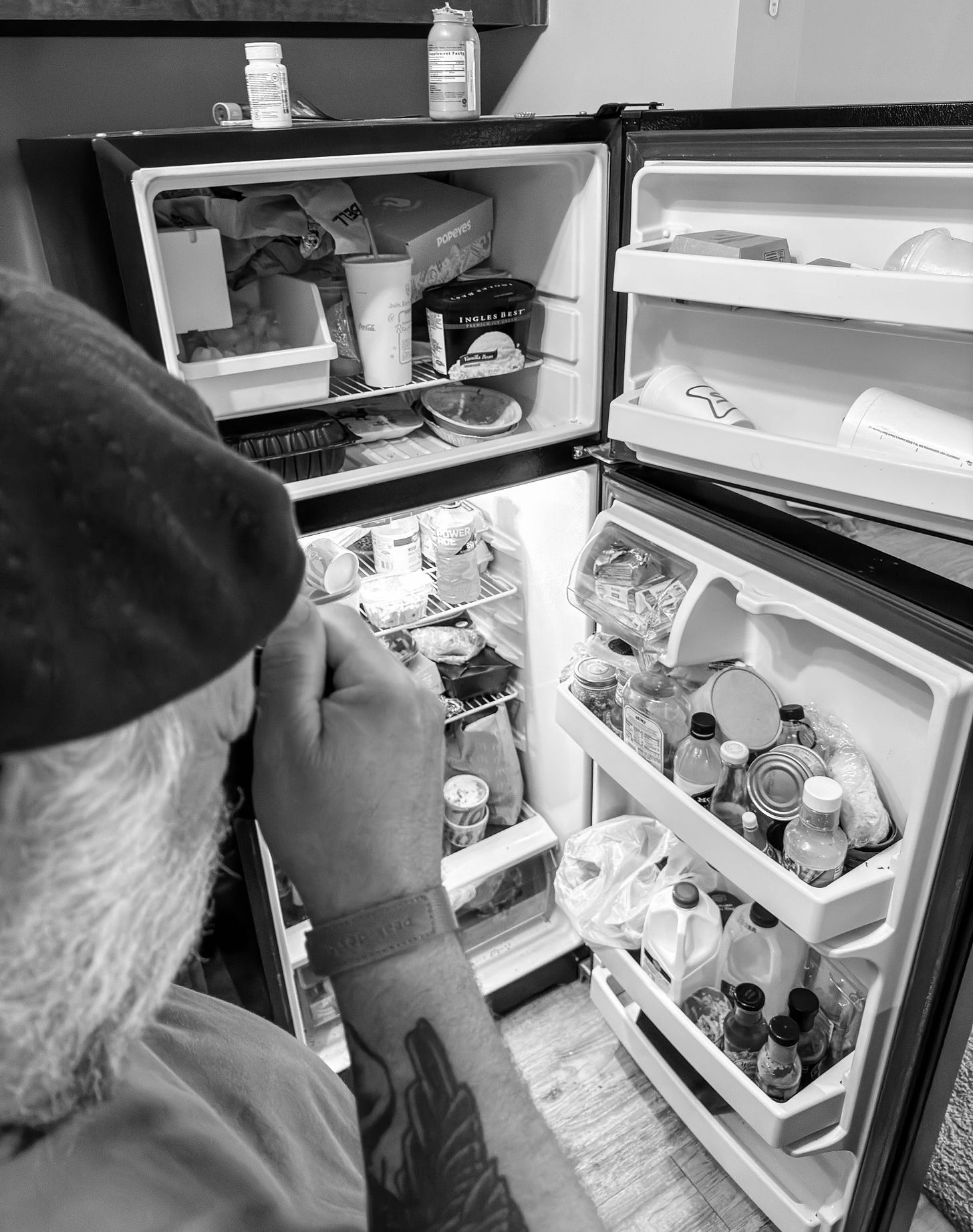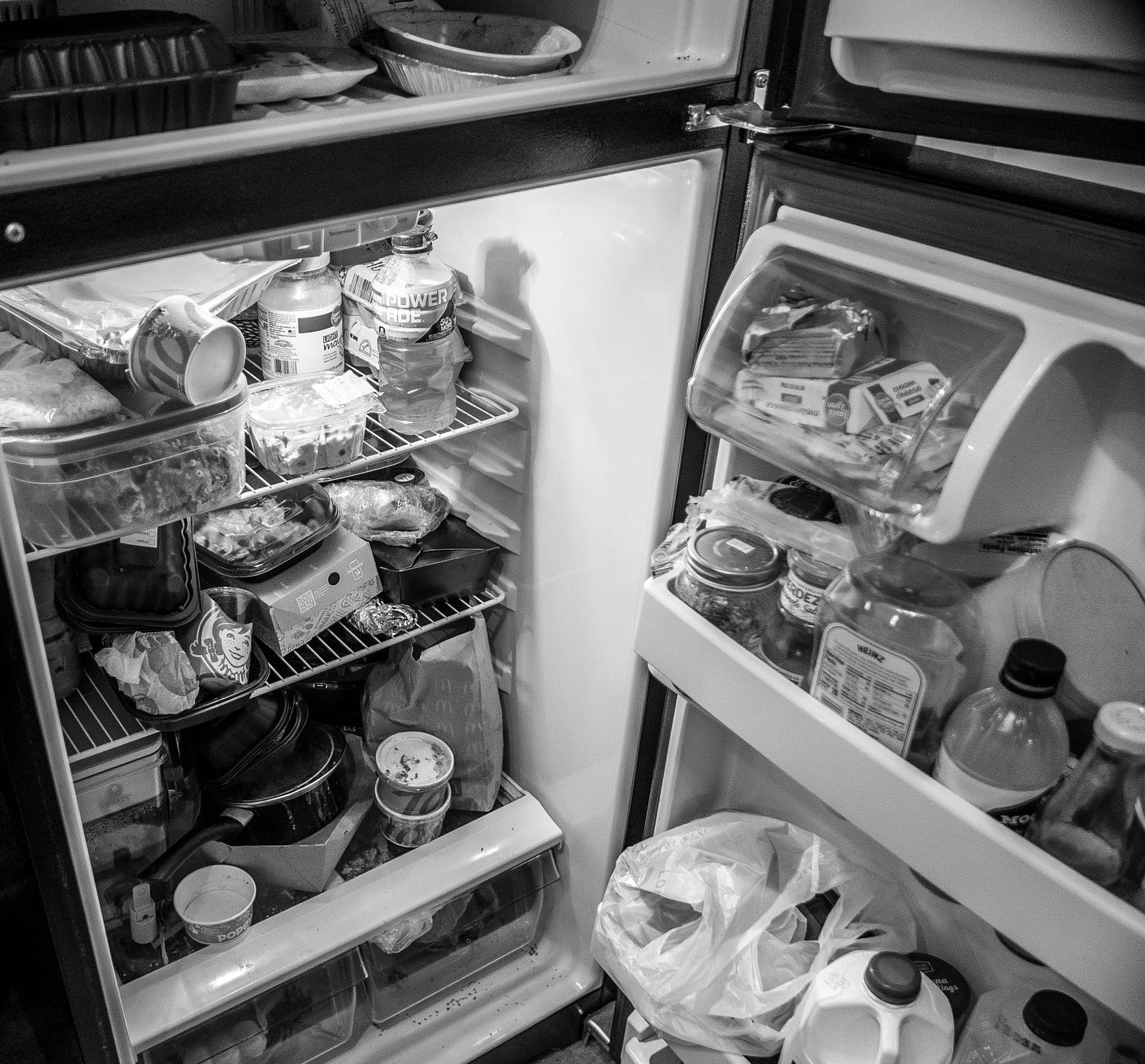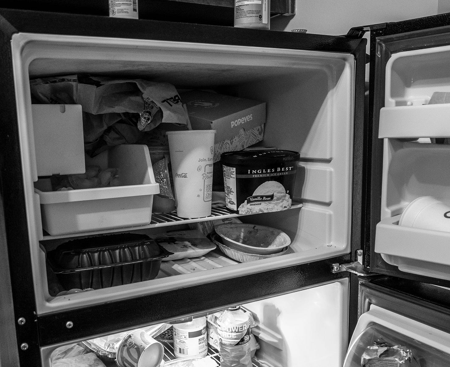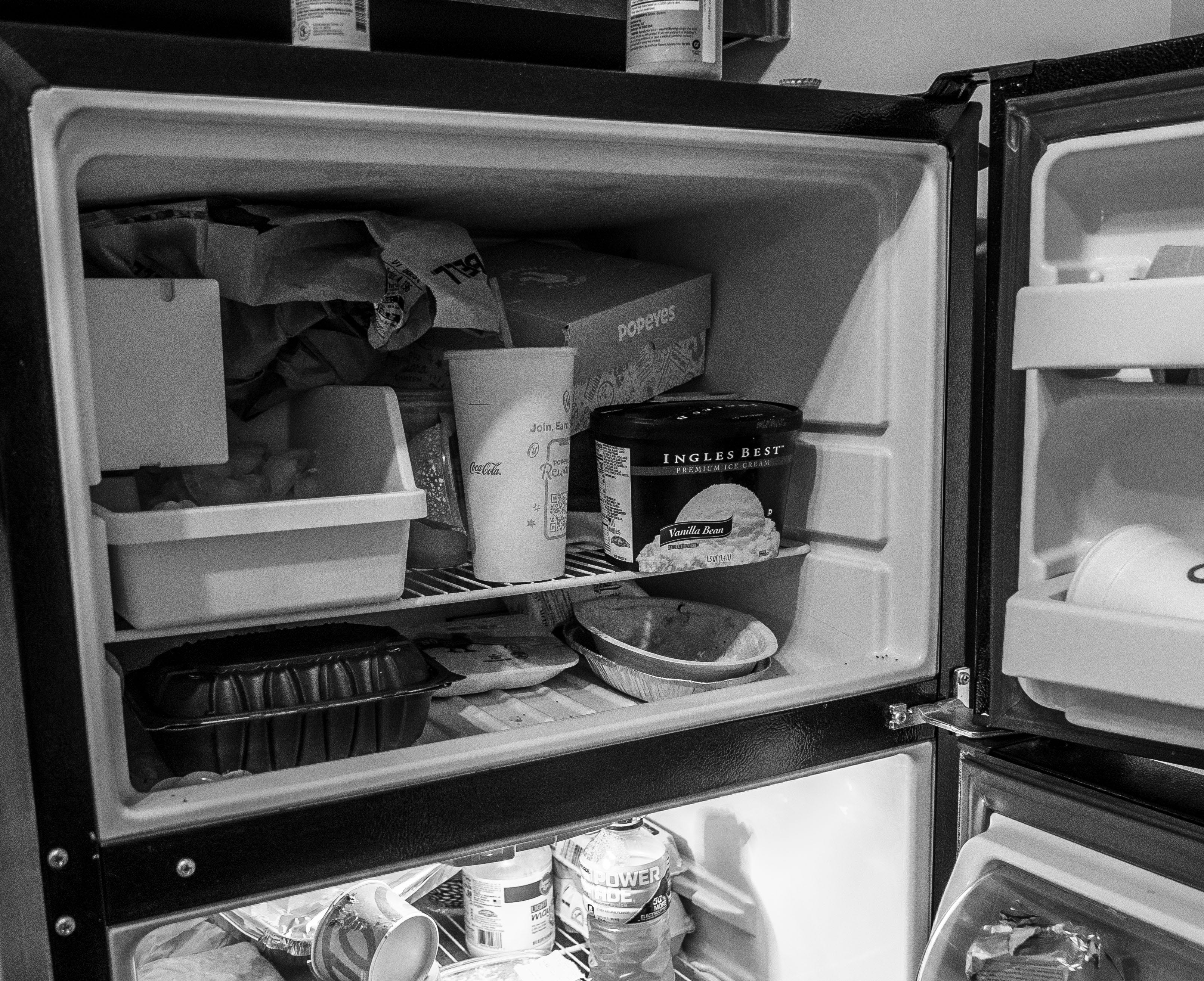 A refrigerator still holds what someone intended to return to. Containers are stacked without care, but not without purpose. Drinks remain half-considered. A freezer carries the logic of preservation, even as nothing within the space appears to have been preserved. It is not neglect in the immediate sense, but something slower—an erosion of intention that leaves function intact while meaning slips away.