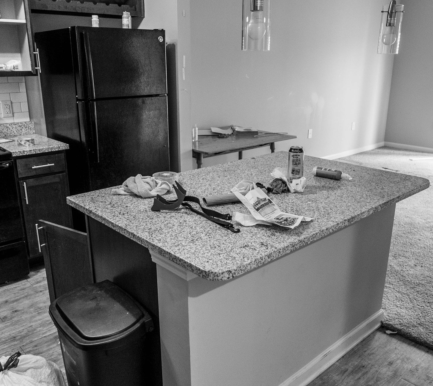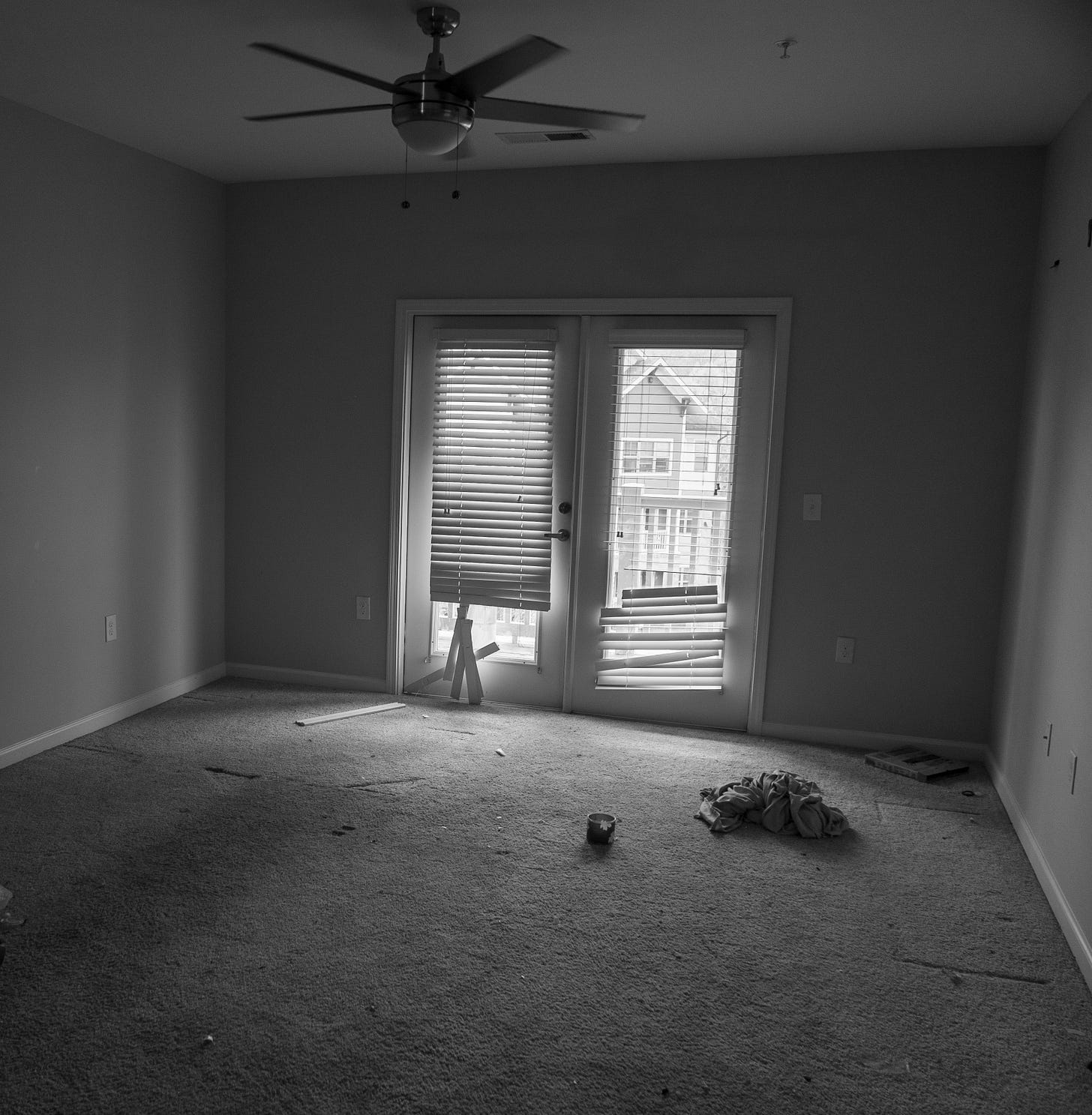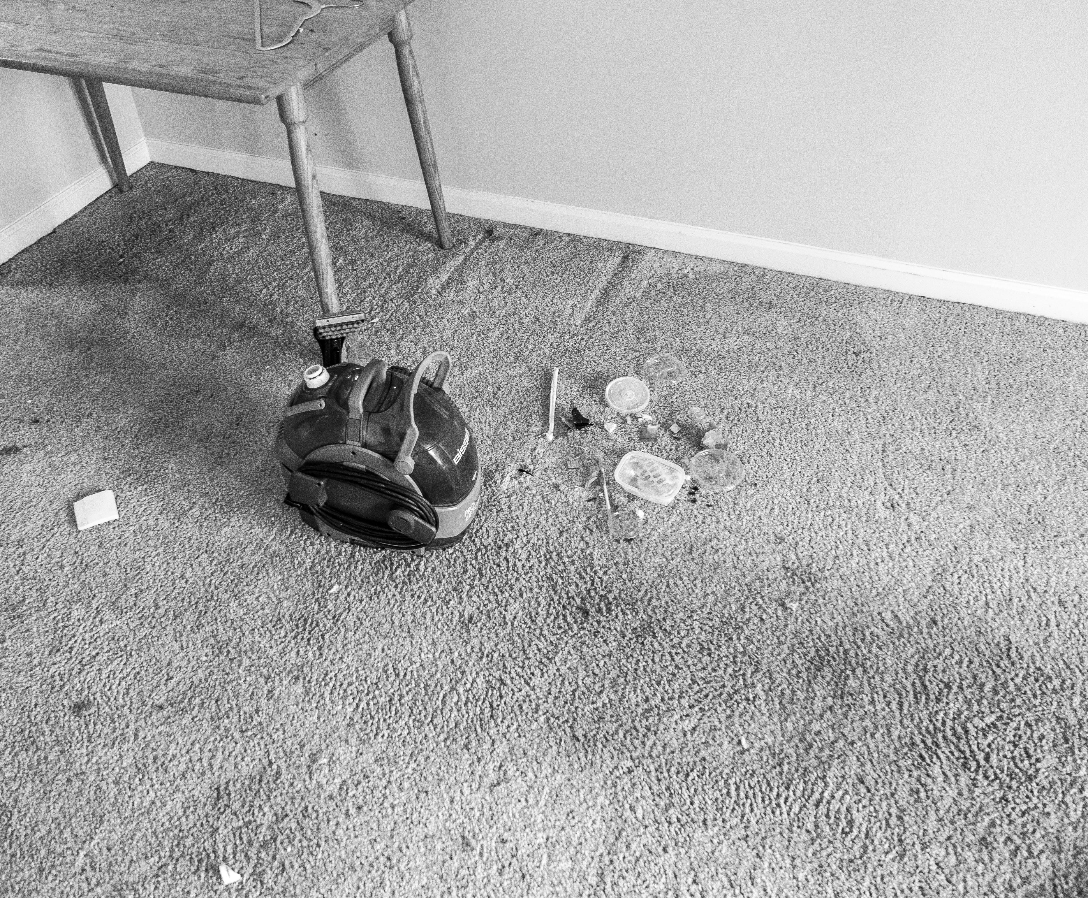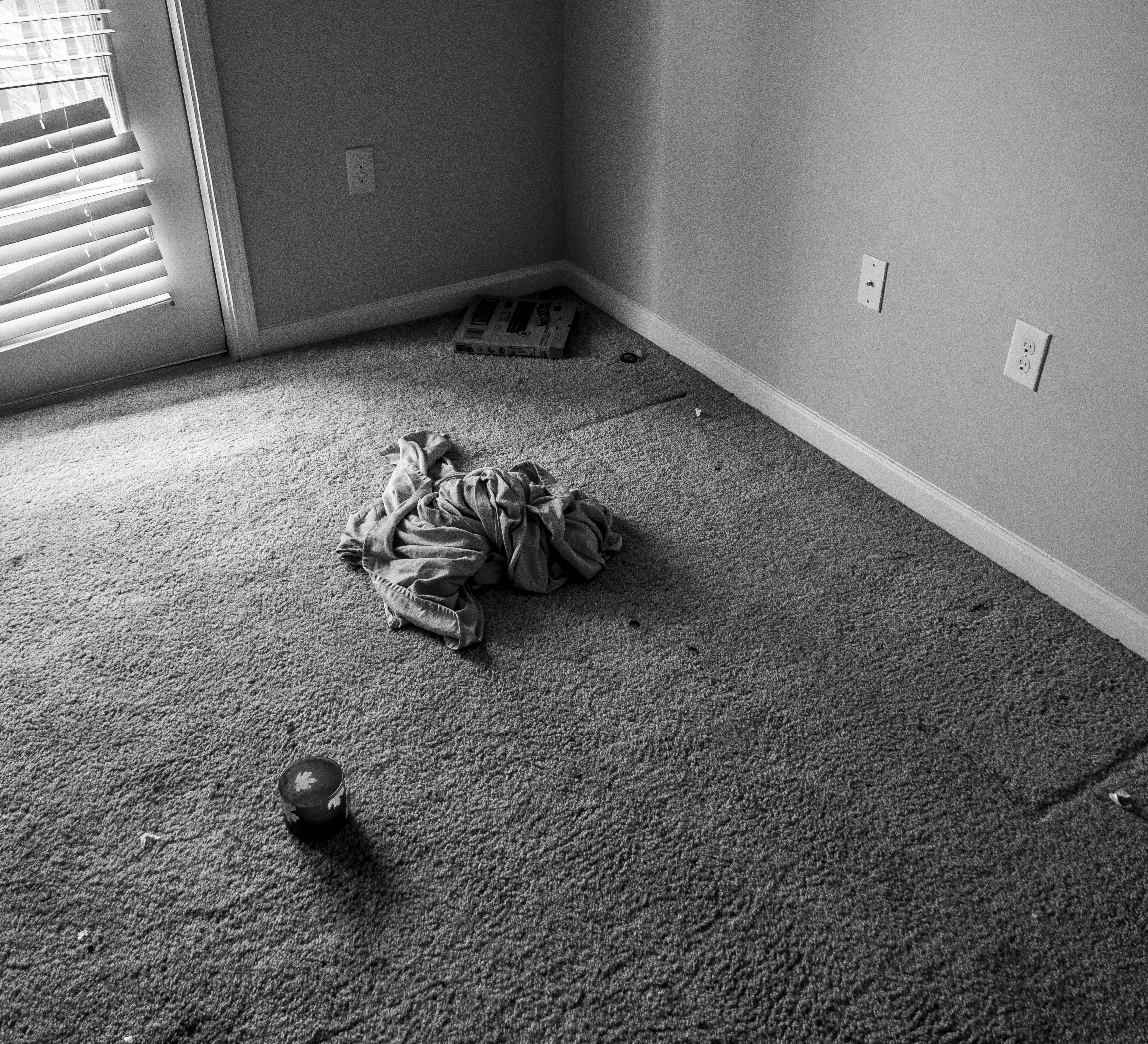 Carpeted surfaces carry the most persistent traces. Impressions remain where objects once rested. Debris settles into fibers, resisting easy removal. The floor records duration rather than action, the slow accumulation of presence rather than any single decisive moment. In the larger room, light enters through broken blinds, diffused and uneven, illuminating nothing in particular. A candle sits unlit. A piece of clothing has been left behind without indication of return. The room does not appear abandoned in haste; it appears abandoned in stages.