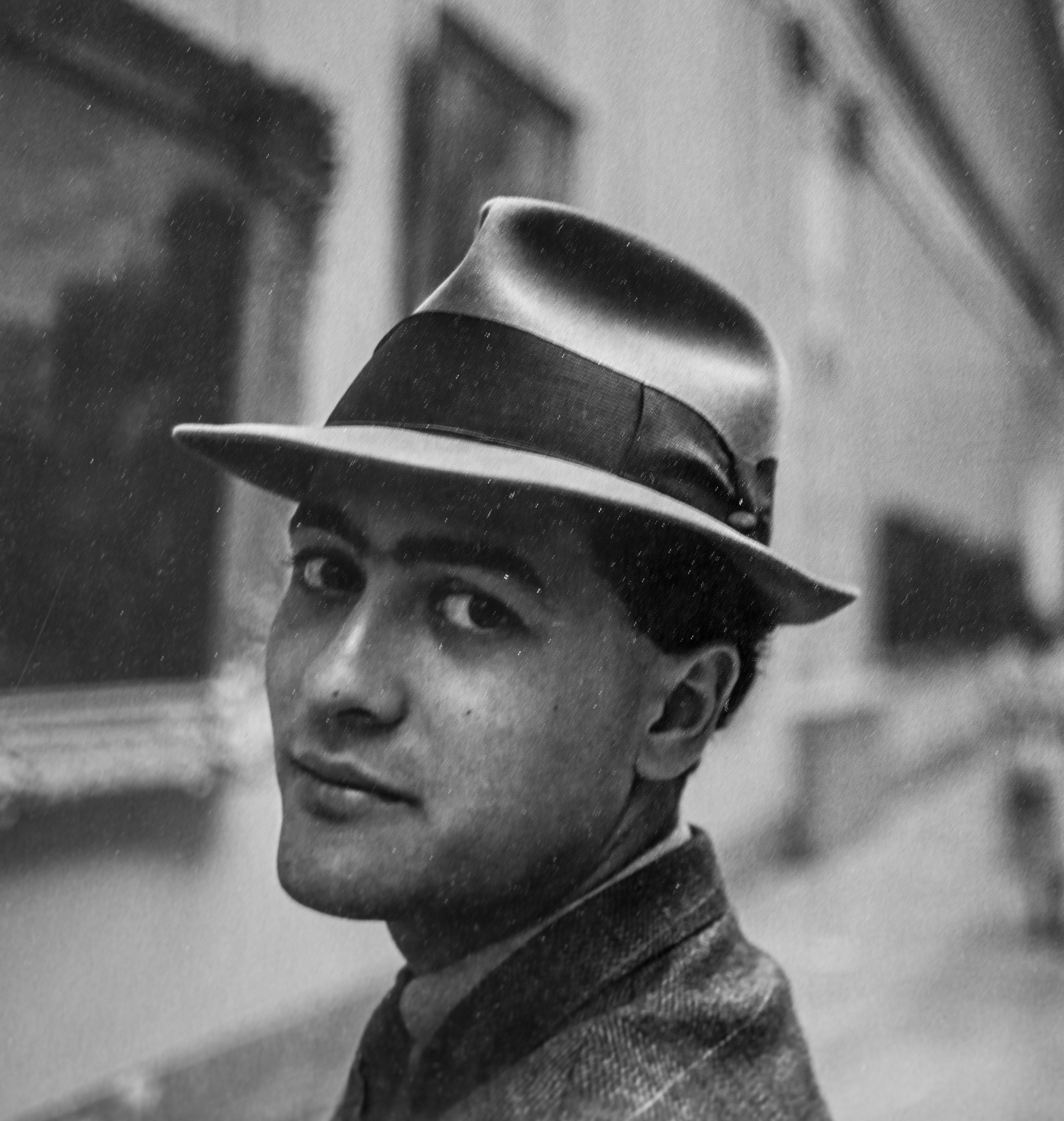 The Ilford grain lends the image its particular tactility — a silver atmosphere that breathes rather than insists. The tonal compression of film produces a softness around the edges of the gallery walls, allowing the fedora’s clean line to assert itself against the architecture. The subject’s glance is neither staged nor defensive. It suggests awareness — of the photographer, of the moment, perhaps even of being observed within a space dedicated to observation.