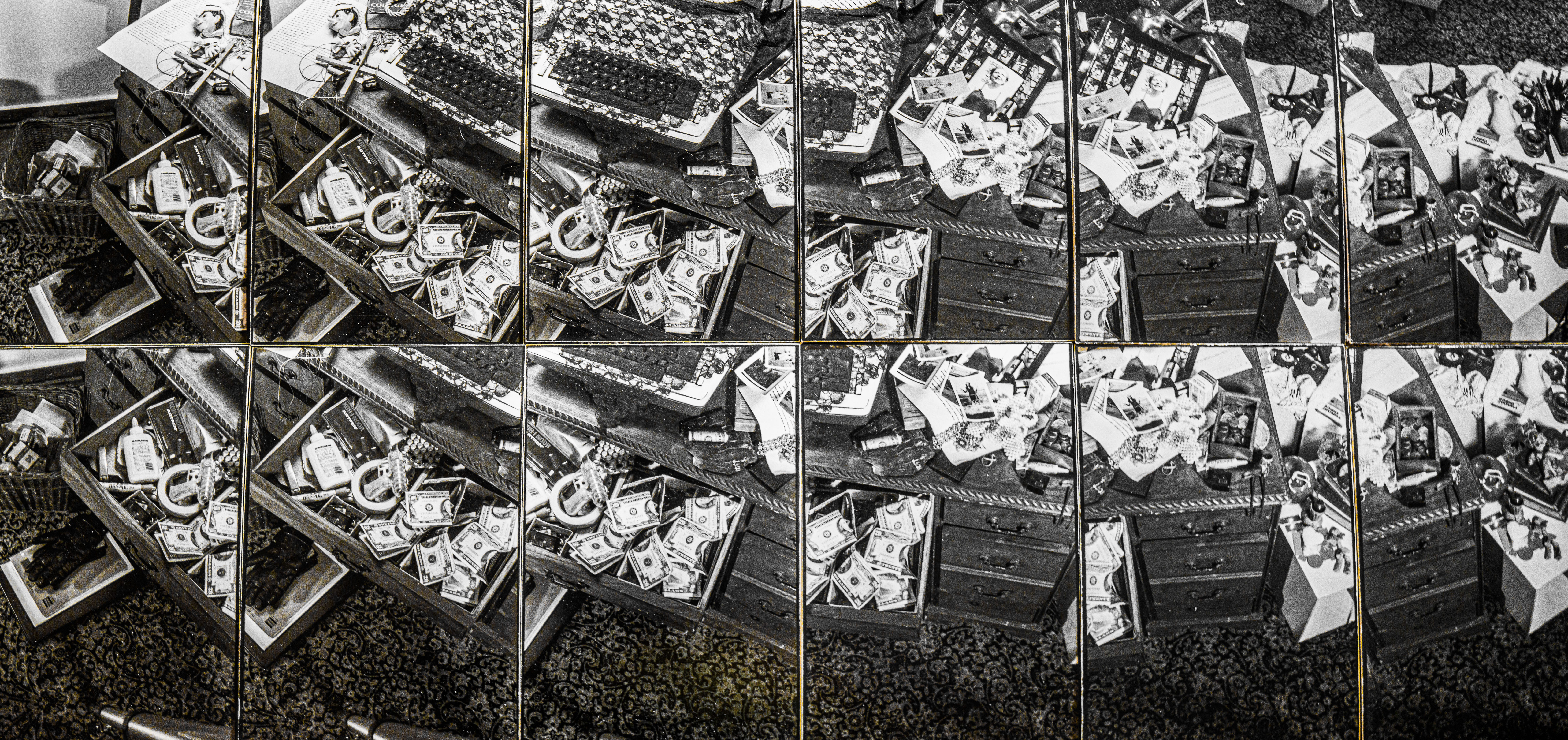 The final panel offers no narrative resolution, only accumulation. Money appears openly, but without drama. It is not displayed as power or temptation; it is treated as clutter. Drawers are left open, bills lie loose, value stripped of ceremony. The grid flattens hierarchy entirely, granting cash no more dignity than lace or trinkets. What matters is not what is owned, but how easily it fits into the pattern.